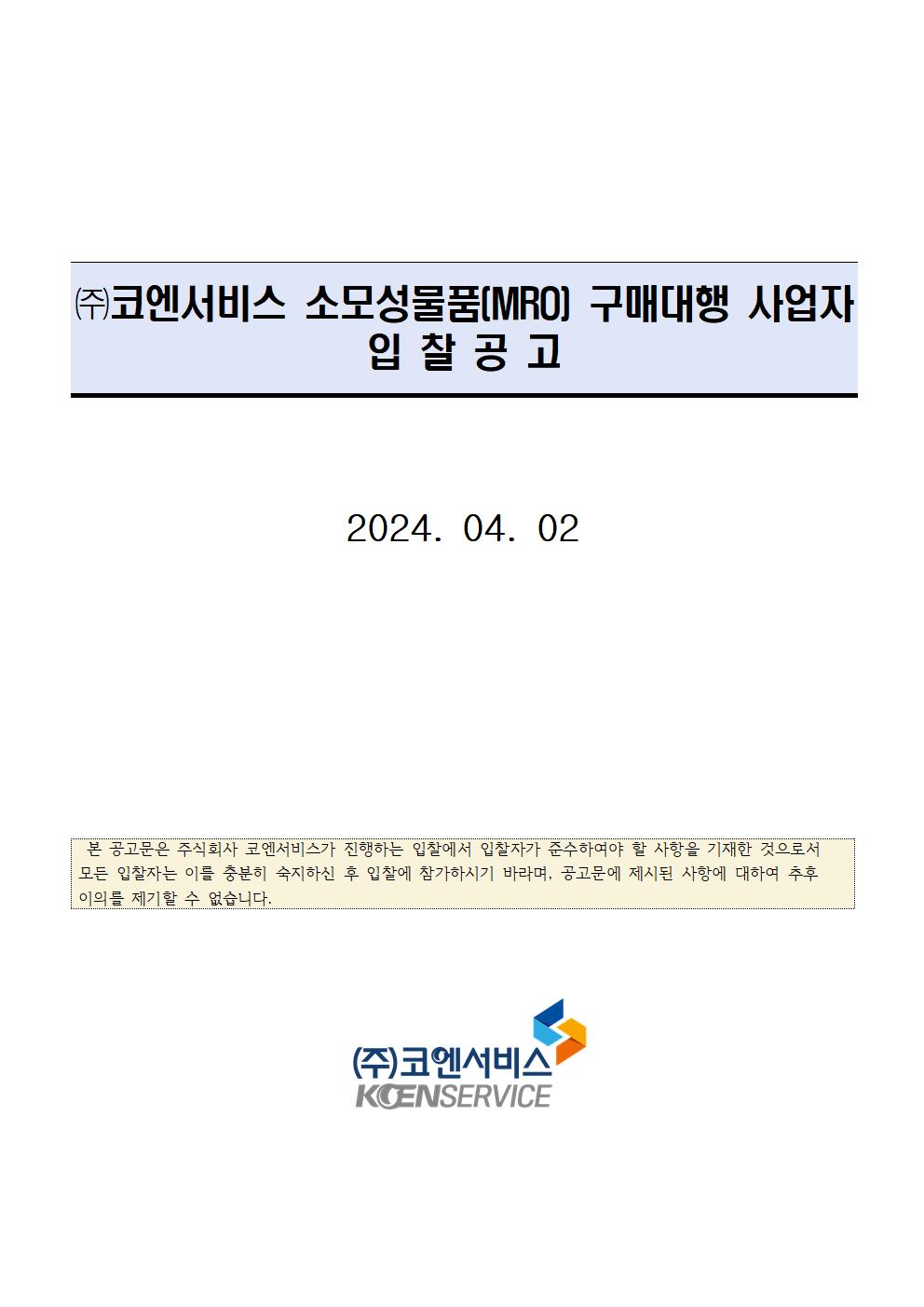 [입찰공고] (주)코엔서비스 소모성물품(MRO) 구매대행 사업자 선정 입찰공고 (재공고) (종료)